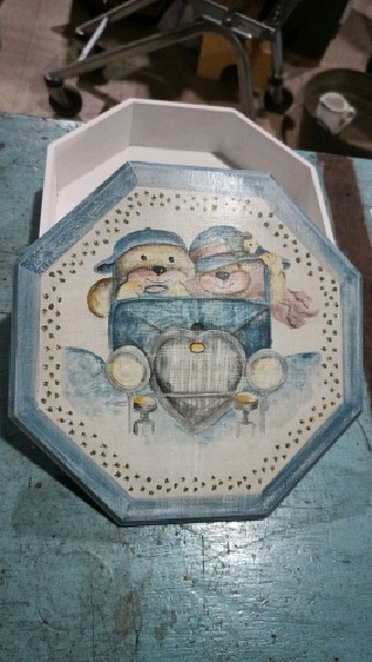 Esta encantadora caja octogonal presenta un dulce diseño de ositos que evocan nostalgia y calidez. Perfecta para guardar pequeños tesoros, joyas o recuerdos, su estilo vintage la convierte en un objeto de colección ideal para los amantes de la decoración retro. Además, su forma octogonal agrega un toque único a cualquier ambiente. ¡Dale una segunda vida a tus espacios con esta hermosa pieza!