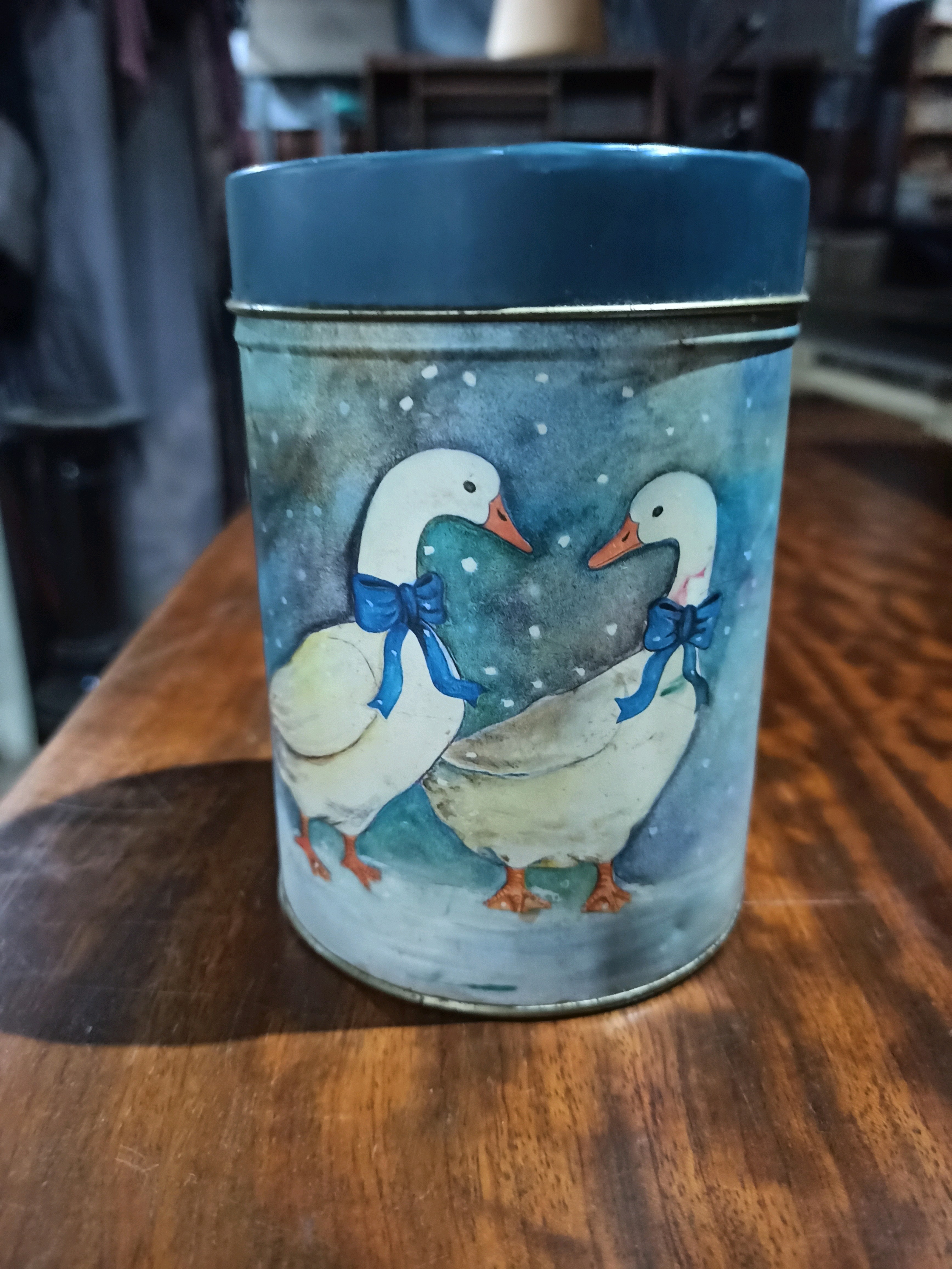 Esta encantadora lata vintage, adornada con una ilustración de patos, no solo es un objeto decorativo, sino también un recordatorio de tiempos más sencillos. Perfecta para almacenar pequeños tesoros, como cartas, botones o incluso golosinas, su diseño atractivo hace que sea un excelente complemento para cualquier espacio. Además, su estilo retro aporta un toque de nostalgia a tu hogar. Ideal para aquellos que aprecian la belleza de lo vintage y lo funcional.