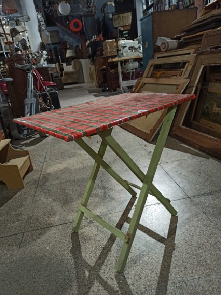 Esta mesita plegable es perfecta para esos momentos en que necesitas un espacio extra sin comprometer tu estilo. Con un atractivo estampado en la superficie y patas de color verde, se adapta fácilmente a cualquier rincón de tu hogar. Ideal para usar como mesa de apoyo en el living, como mesa auxiliar en la habitación, o incluso para un picnic improvisado en el parque. Su diseño ligero permite que la lleves a donde quieras, y su historia se refleja en cada rasguño y marca, contándote un poco sobre los momentos que ha vivido. ¡Dale una nueva vida a tus espacios con esta mesita versátil!